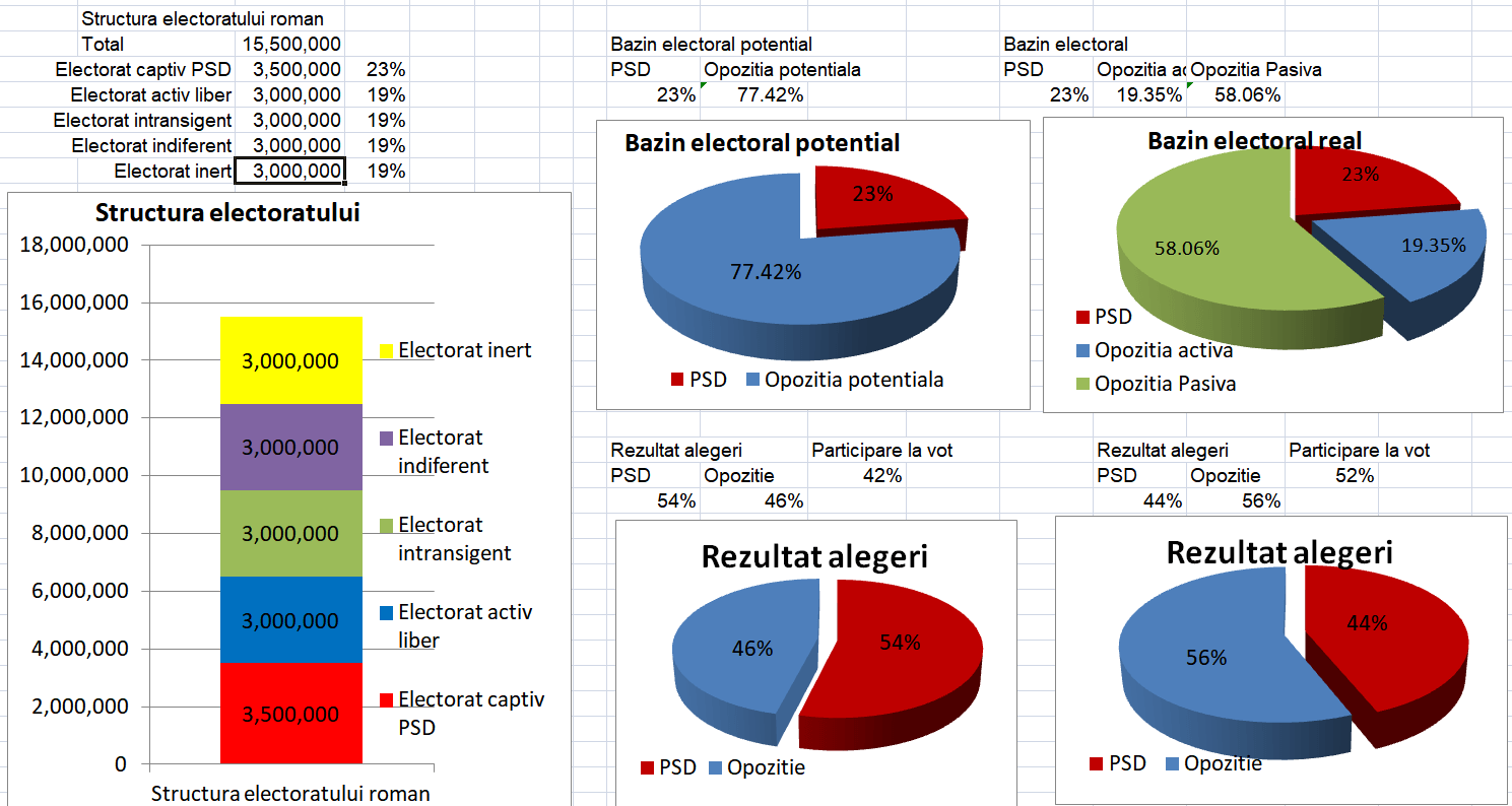 1. Electoratul activ captiv: 3.5 milioane de alegatori. Ies la vot cand li spune si voteaza cu cine li se spune de catre cei care le controleaza subzistenta prin intermediul venitului conditionat politic de la Stat. Aici nu intra doar asistatii sociali ci si o mare parte din bugetari.